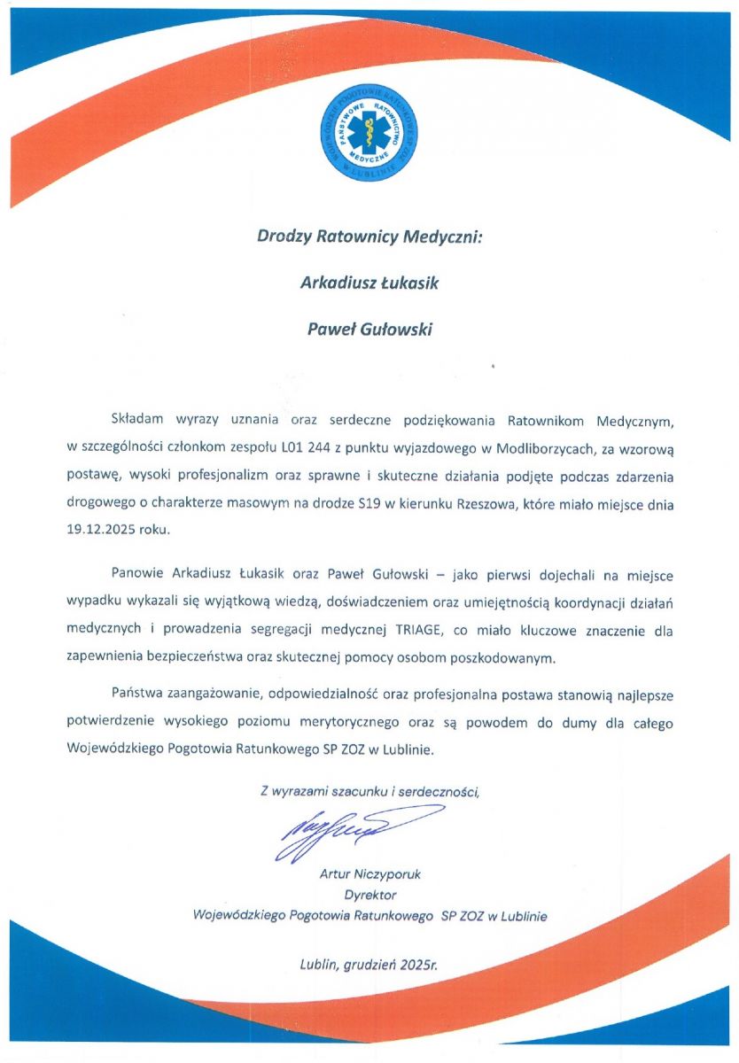 Serdeczne podziękowania dla zespołu ZRM L01 244 - Arkadiusza Łukasika, Pawła Gułowskiego oraz koordynatora medycznego Filii Kraśnik - Łukasza Buraka za wzorowe i sprawne kierowanie działaniami ratunkowymi podczas zdarzenia drogowego o charakterze masowym na drodze S19 w dniu 19.12.2025 r.